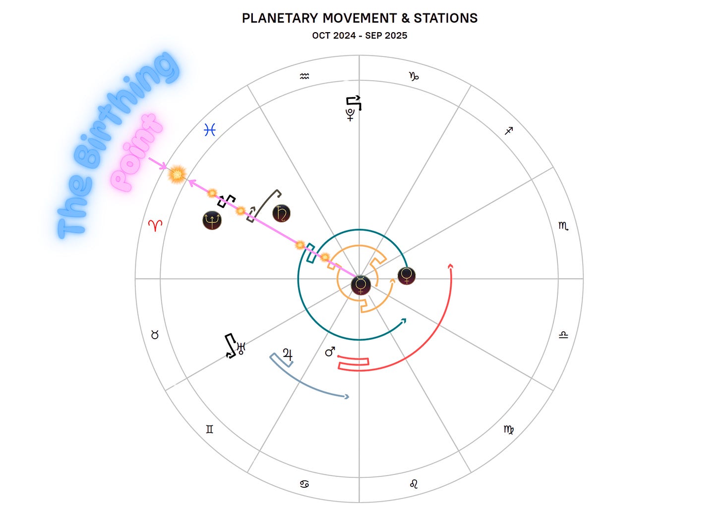 When I dive into the astrology of 2025 I first see a clear and bright personal correspondence to beginnings. My natal Sun is at 0°Aries, the birthing point of the zodiac, aka the Pisces/Aries cusp. Which is probably the point in the zodiac to be looking at this year. Check out the transit the chart below and you’ll see why. No other cusp is getting so much action with Mercury, Venus, Saturn and Neptune all doing a magical three passes over the cusp due to a rare line up of retrograde cycles over the birthing point.